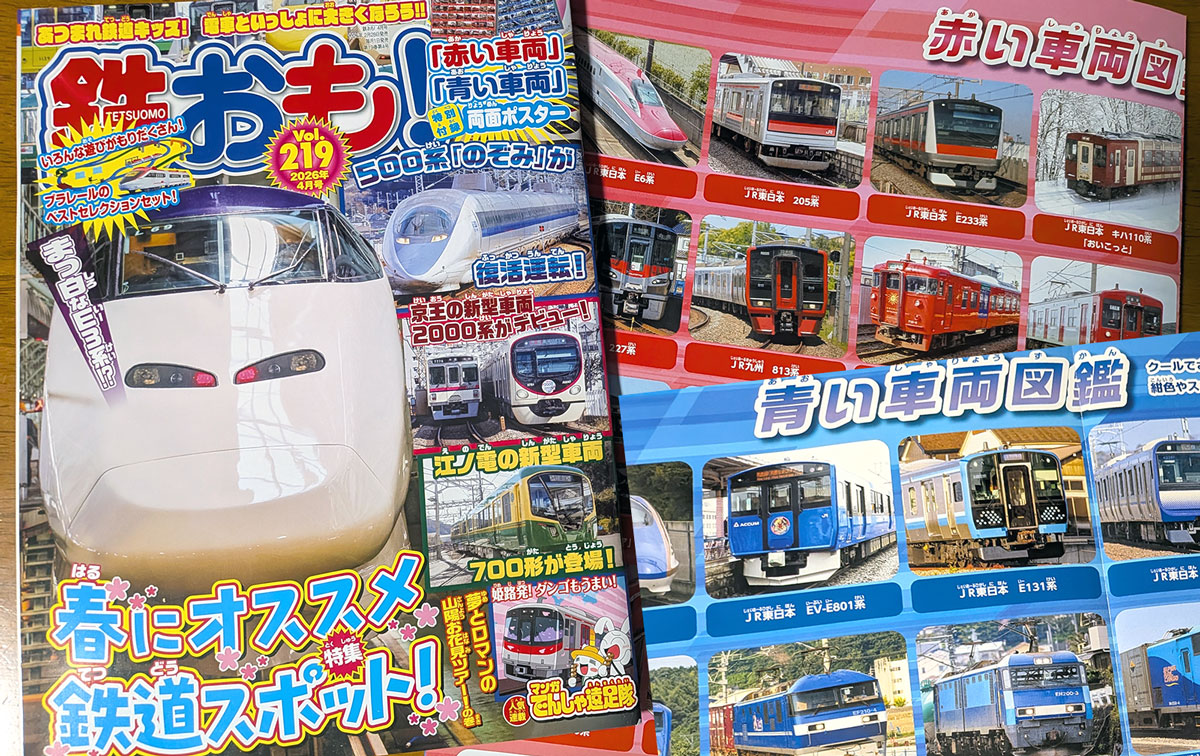 作った鉄道雑誌「鉄おも!」219号にマンガを描きました/山陽お花見ツアー 作った X Facebook0 はてブ0 LINE コピー コメント 2026.03.10記事内に広告が含まれています。2月28日発売の 雑誌「鉄おも!」2025年04月号(Vol.219)に連載中の「マンガでんしゃ遠足隊」最新話を描きました。今月は「夢とロマンの山陽お花見ツアー!の巻」と題して、兵庫県の姫路市から山陽電車沿線でお花見が楽しめるスポットをめぐる遠足エピソードです。付録は、列車の写真がズラリならぶ両面ポスターで、片面が赤い車両図鑑、もう片面が青い車両図鑑。同系統の色の車両がこれだけ集まるとなかなか壮観! 身近に走る赤や青のあの車両も入ってるかどうか、ぜひチェックしてみてください。鉄おも2026年4月号 Vol.219【付録:両面鉄道ポスター】ネコ・パブリッシング Amazonの商品レビュー・口コミを見るAmazon楽天